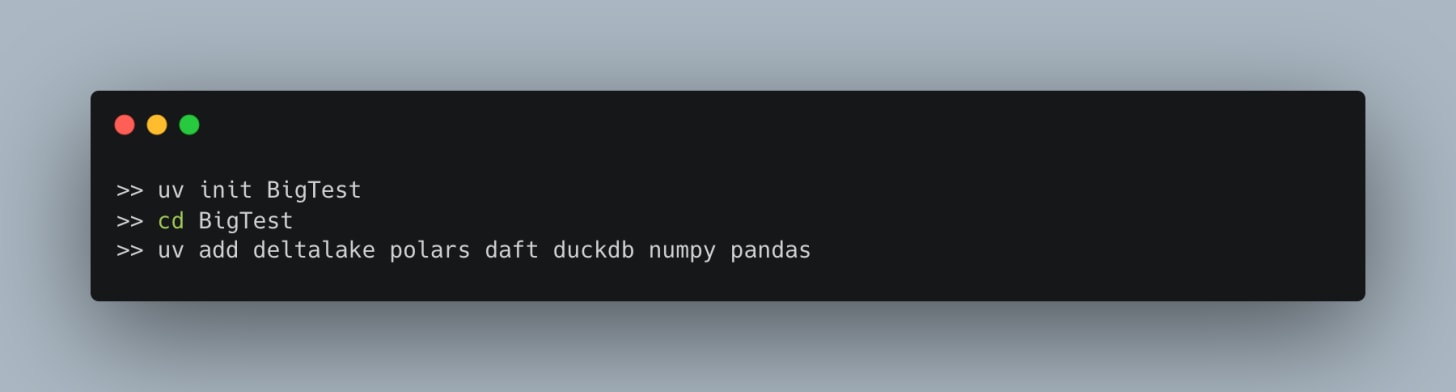 Ok, so to at least simulate what would be a production-like environment, with data that is still small-ish, but approaching reality, let’s get our test setup to see if we can choke Polars and DuckDB (and Daft to keep ‘em honest), because we know Spark would have zero problems with data this size.