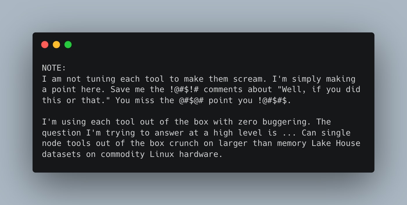 Of course, this was not some scientific TCP benchmark; it’s not like those are fair either half the time. We were not so much concerned about who’s the fastest as much as whether these single-node tools can handle large Lake House datasets on small memory footprints without giving up the ghost.