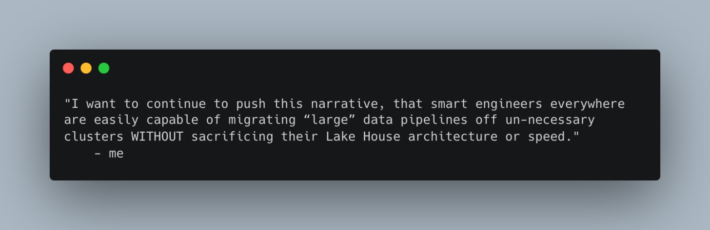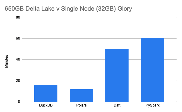 Not only is it not cheap to crunch 650 GB of data on a Spark cluster —piling up DBUs, truth be told — but it’s not complicated either; they’ve made it easy to spend money. Especially when you simply don’t need a cluster anymore for *most datasets and workloads.Sure, in the days of Pandas when that was our only non-Spark option, we didn’t have a choice, but DuckDB, Polars, and Daft (also known as D.P.D. because why not) … have laid that argument to rest in a shallow grave.