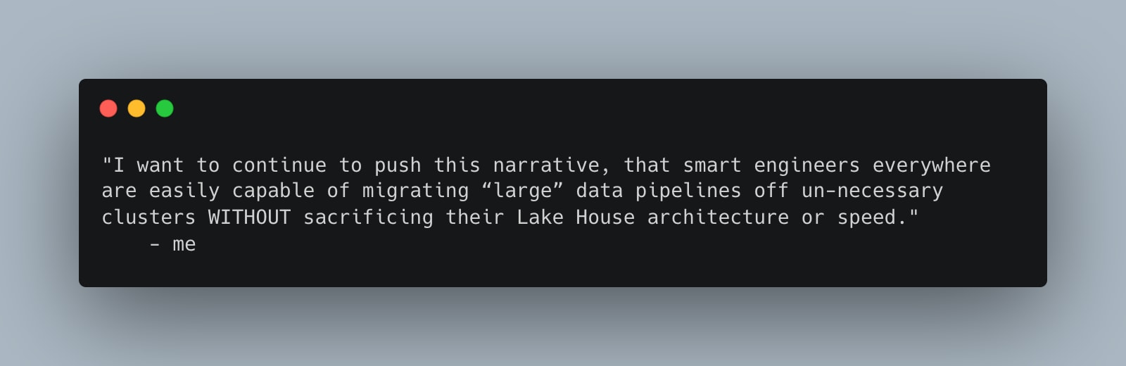 Truly, we have not been thinking outside the box with the Modern Lake House architecture. Just because Pandas failed us doesn’t mean distributed computing is our only option.