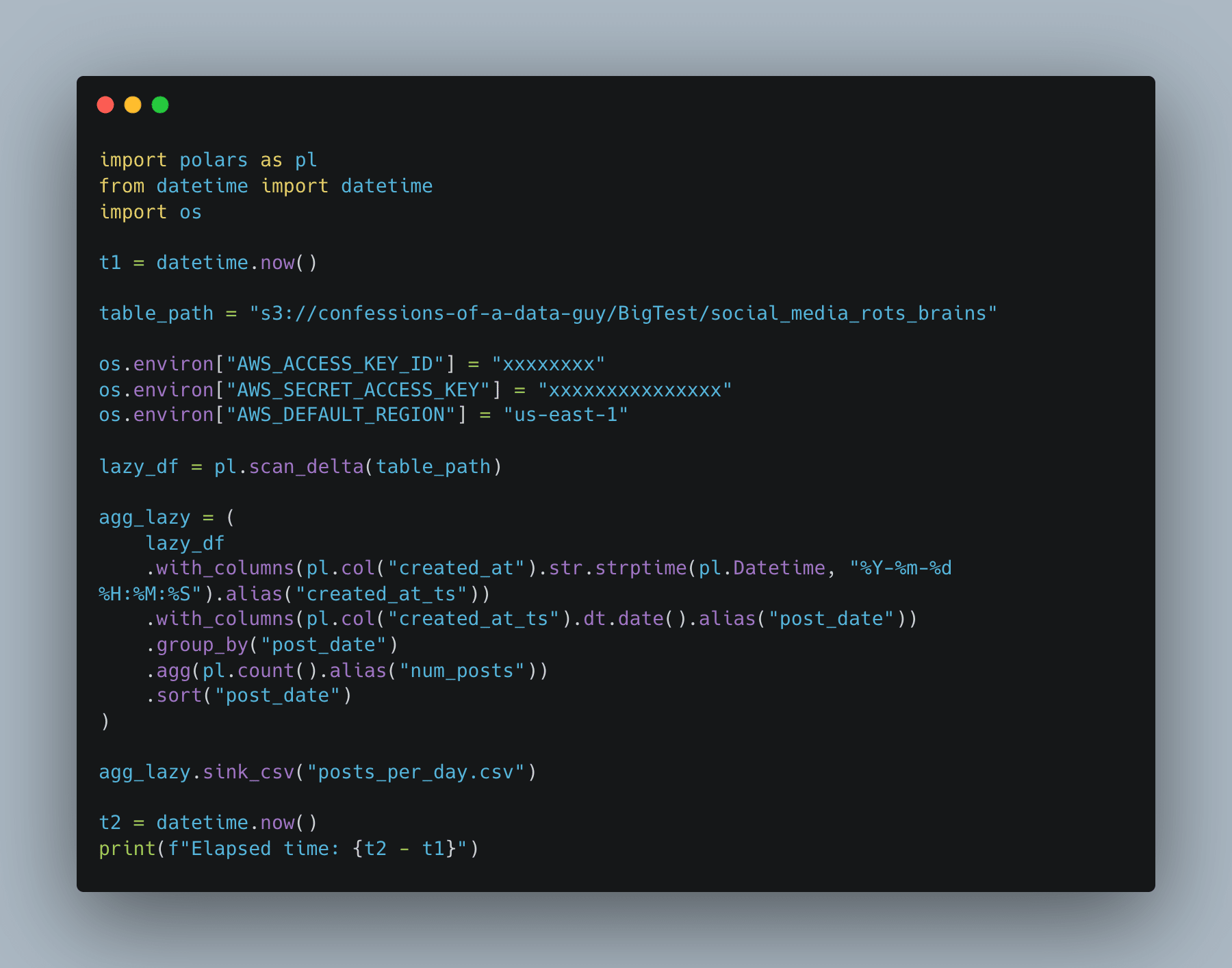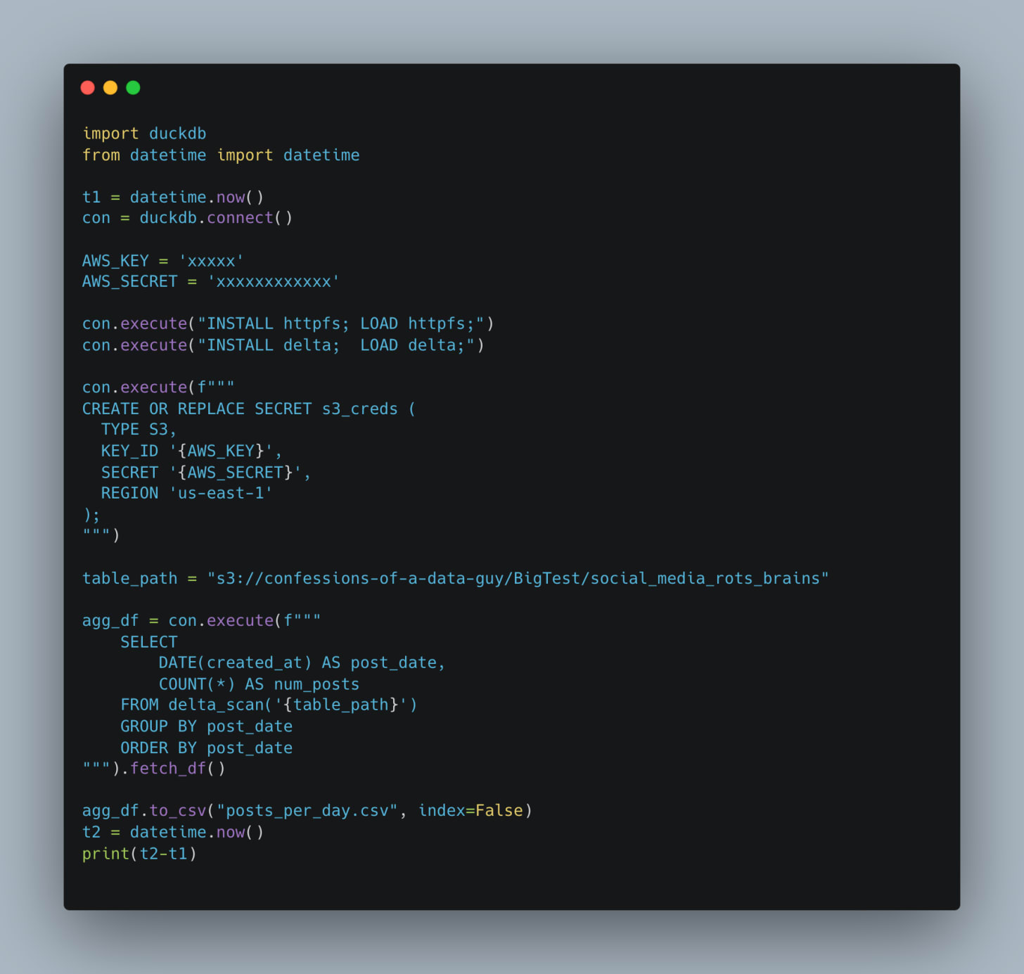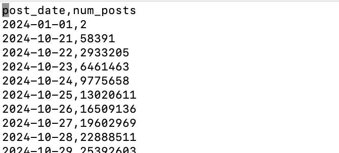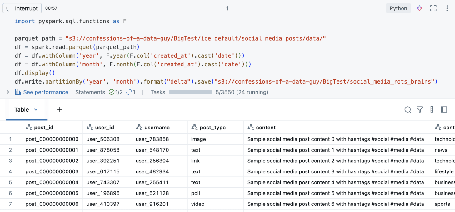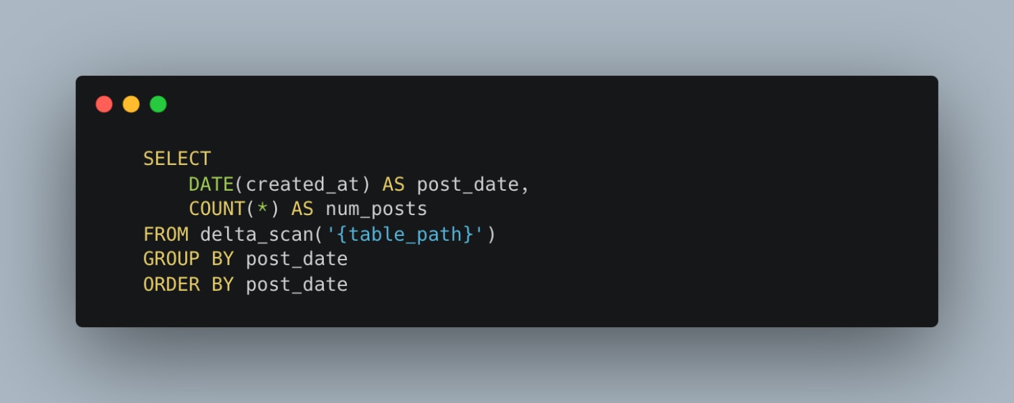 Not sure if you noticed it above, but I’m using a fake social media posts dataset. What we need now is a query that reads the entire dataset and performs some work, like aggregation.