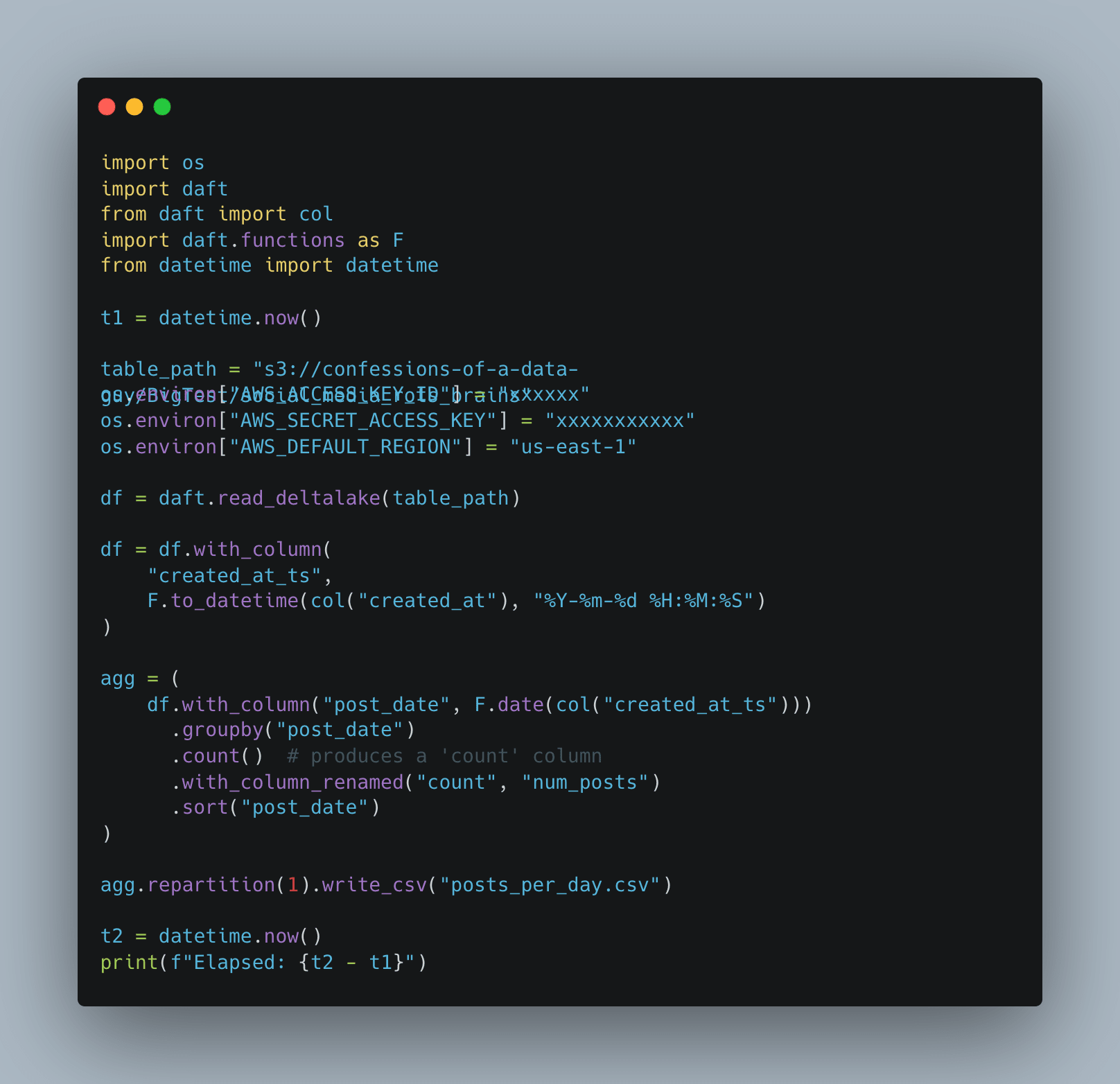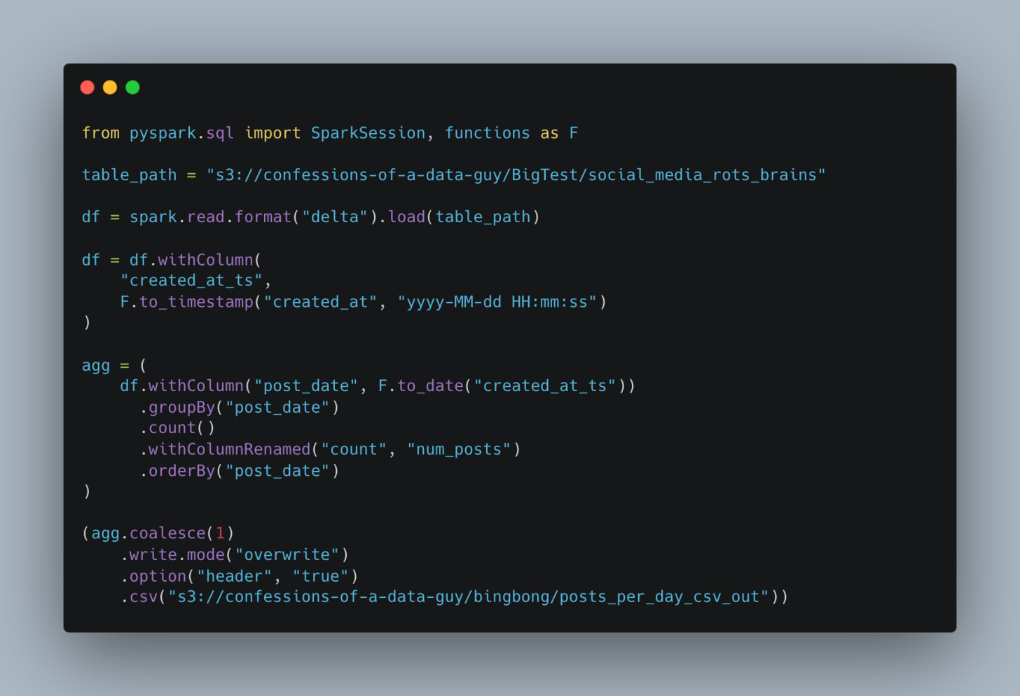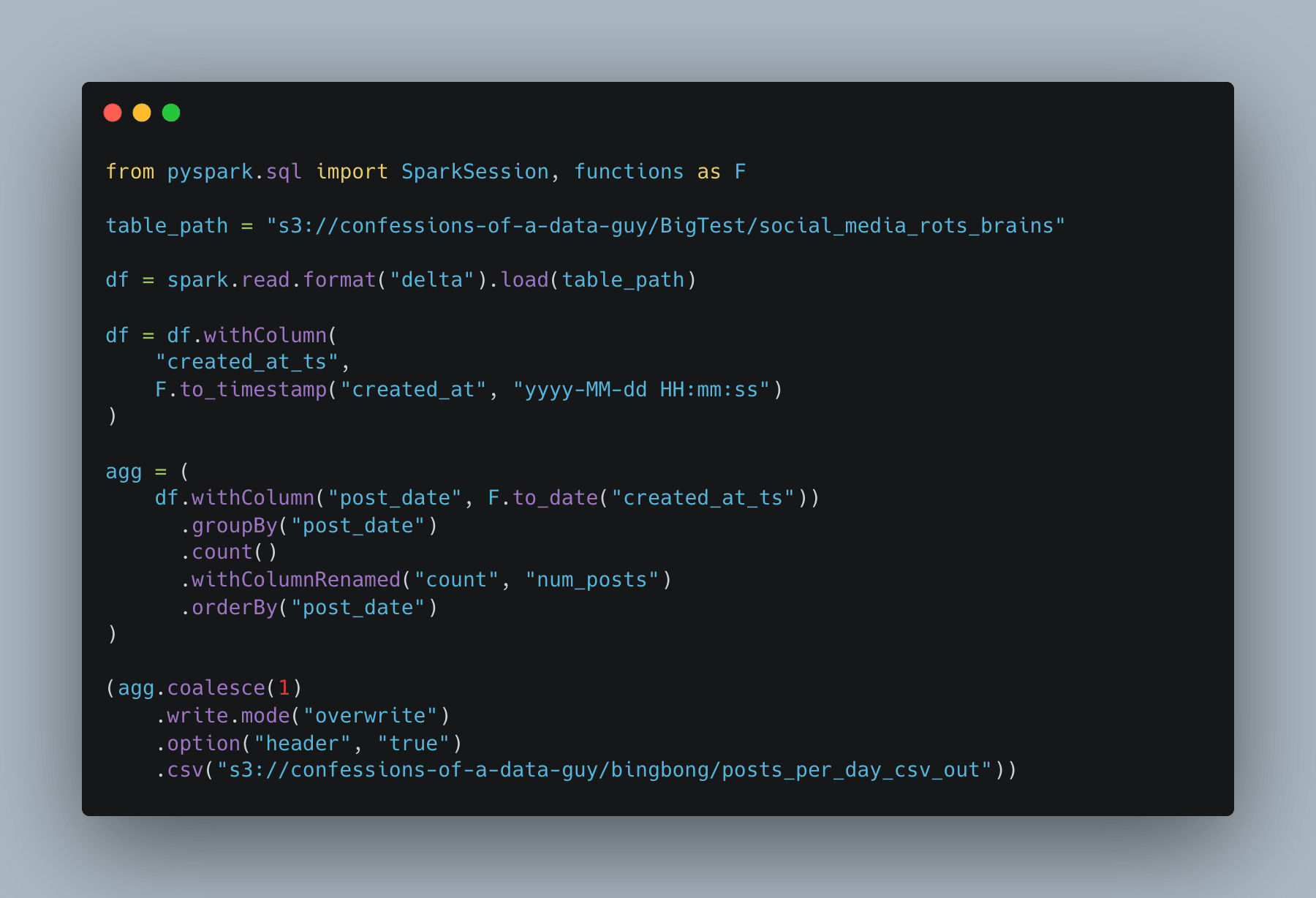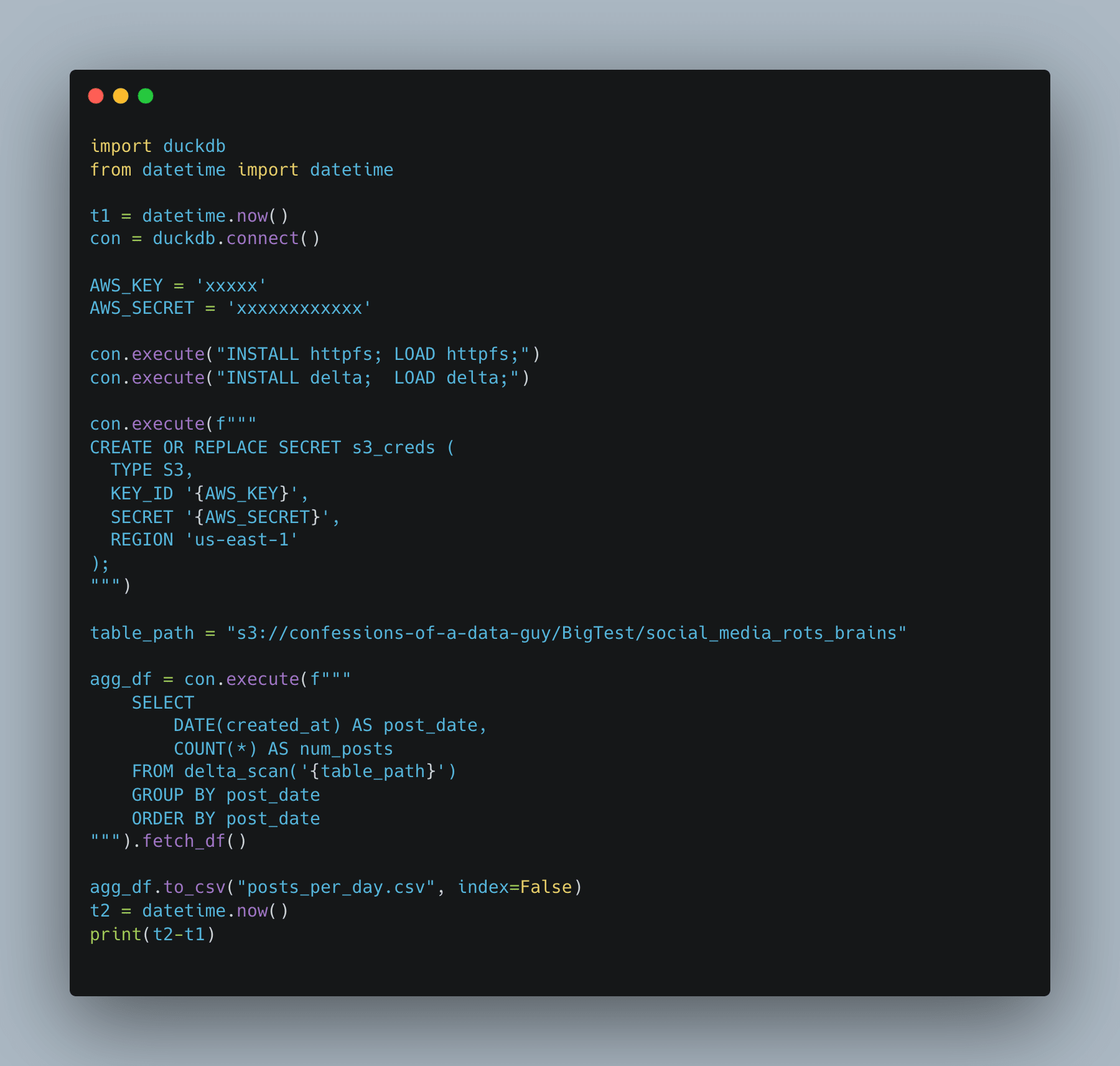 Not sure if you noticed it above, but I’m using a fake social media posts dataset. What we need now is a query that reads the entire dataset and performs some work, like aggregation.