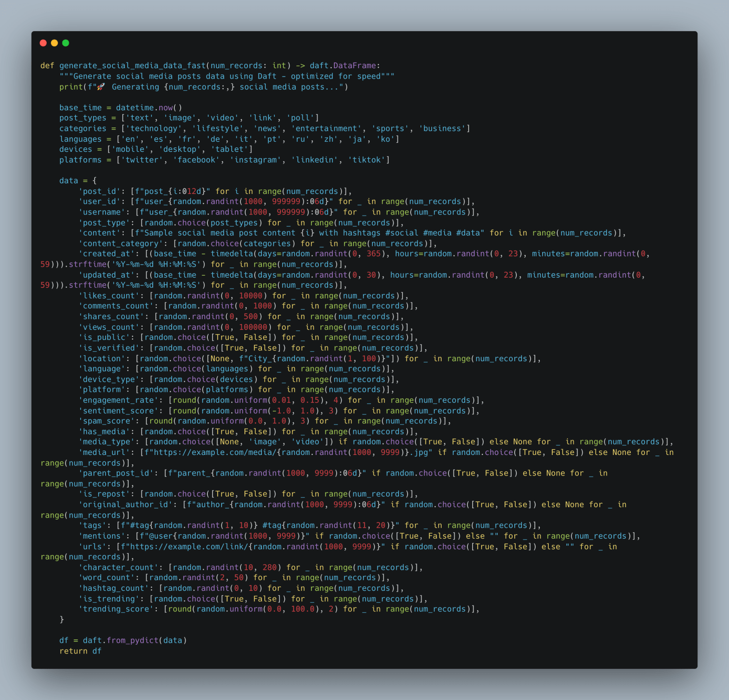 Next, we must somehow generate 650GB of data. What we will do is just mock up some data that could be described as social media posts, make a dict with Python, and convert it to a Daft Dataframe that can be written to a parquet file.