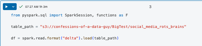 Next, we need to convert these Parquet files into a Delta Lake table. Easy enough on Databricks.