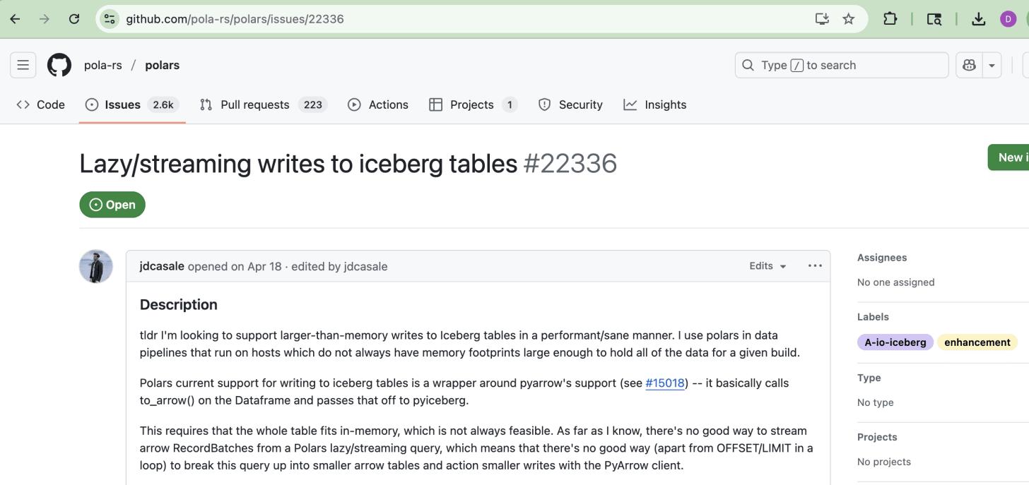In the real world of Lake Houses, where we could use either Delta Lake or Iceberg, if we wanted to do this in production, we would want tools that do not OOM and can work on datasets larger than memory. Again, this is what we are trying to answer, is it even remotely possible?Apparently, this is not an uncommon use case and a problem that needs to be solved. See here and below for an open Polars issue where someone has this exact problem and wants an out-of-the-box way to “stream writes to Iceberg.”