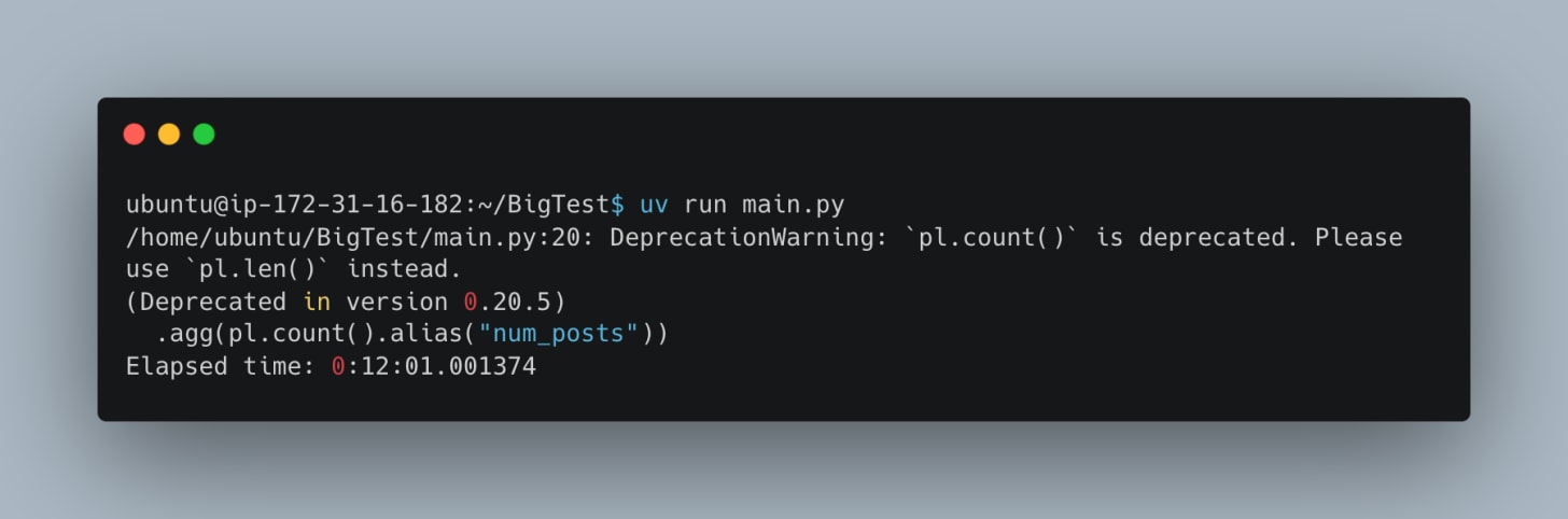 Not much difference between Daft and Polars code-wise, both Rust-based. Egads, that was slow. Done put a dagger in my heart.