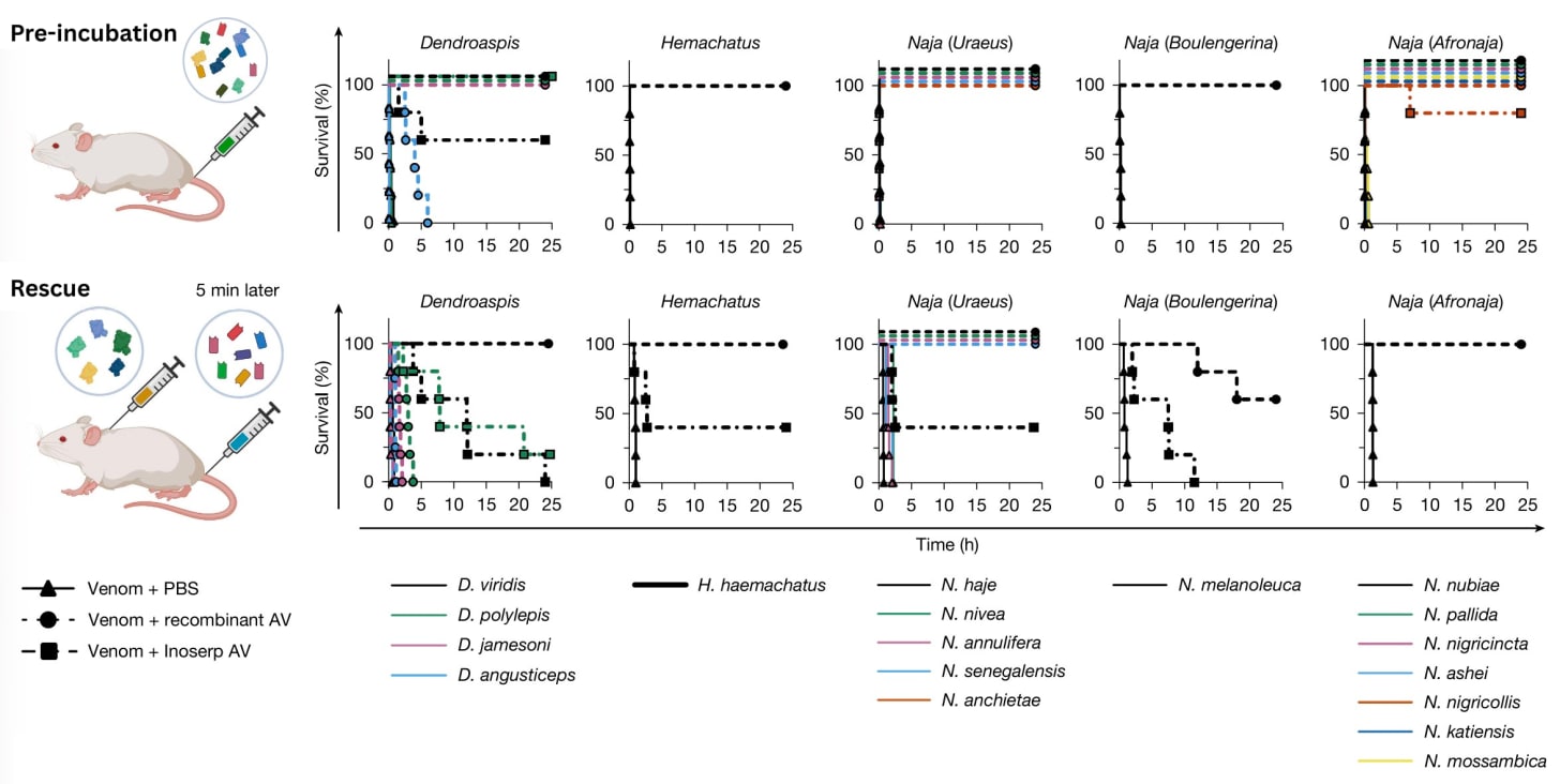 The researchers benchmarked both experiments against the commercially available Inoserp PAN-AFRICA, with the manufacturer’s recommended dose similarly scaled up to contend with three times the median lethal dose of venom. The recombinant antivenom completely prevented lethality for 6 of the snake venoms in the rescue experiments, with no signs of envenoming. The Inoserp PAN-AFRICA antivenom, by contrast, “showed only partial neutralization of all the tested venoms and an extension of time of death for the venom from N. melanoleuca.” In other words, the recombinant antivenom “performed better than the commercial antivenom on all included venoms at the tested doses.