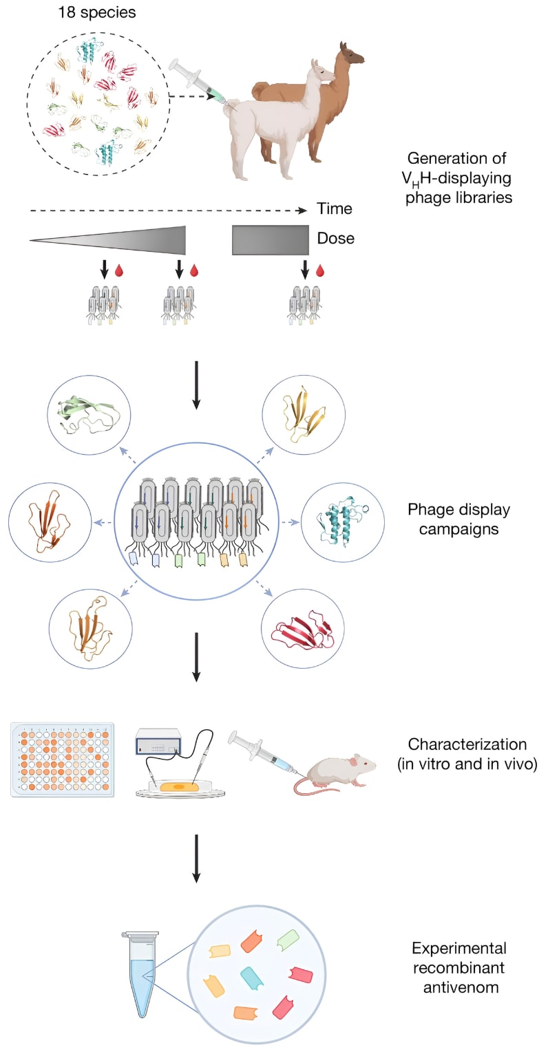 The approach in the Nature study out today aims to provide just that. The researchers began with a process quite similar to traditional antivenom production, milking venom from 18 species of African elapids and injecting each of them into one llama and one alpaca. From here, they increased the dose of these venoms over 60 weeks, administering the animals with larger and larger doses of snake venoms over the span of more than a year. Once inside the camelids’ bodies, these venoms produced an immune response, and the animals began to make antibodies that could be withdrawn and interrogated for the particular traits these researchers sought.