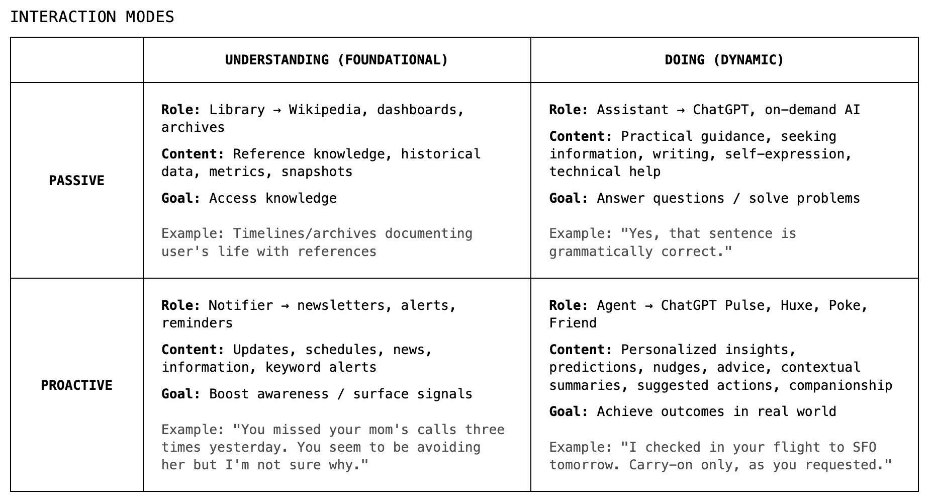 ‘Doing’ gets a lot of attention. In the passive corner, you have chat-style assistants: you ask, they answer. In the proactive box, you have agents, the holy grail of personal AI today (or enterprise; anything really). Book your flight. Order your groceries. Schedule your meetings.
