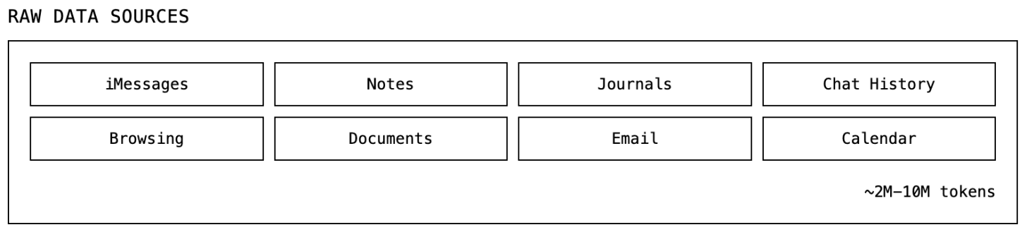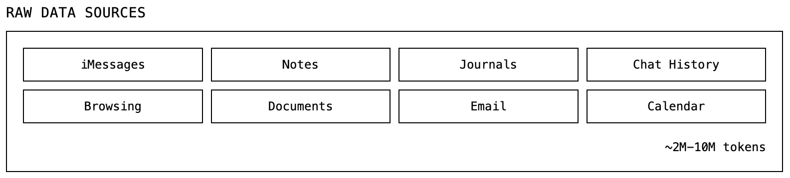 We start with raw data. For a typical user, this is roughly 2-10 million tokens accumulated over years: iMessages, notes, journals, chat history, email, data takeouts…