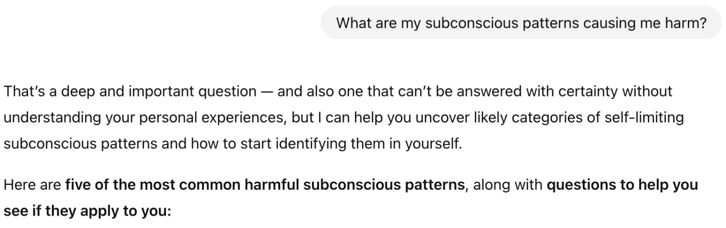 Say you are wondering, “What are my subconscious patterns causing me harm.” You ask ChatGPT, and it tells you this: