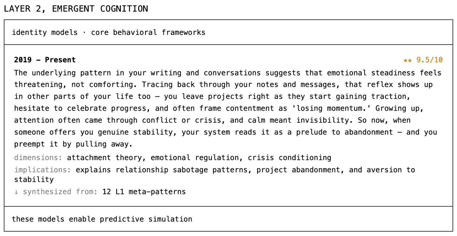 This is where the system takes the relationship sabotage pattern, combines it with others to build a deeper model to explain why you do it. It’s something approximating a theory of you, grounded in years of data, that enables predictive simulation: given a new situation, how might you respond based on your established operating principles? If Maya texts you tomorrow saying she wants to plan a trip together next month, it might flag it to remind you, “You’ve withdrawn in these situations in the past, which hurt the relationship, would you like to talk it through?”