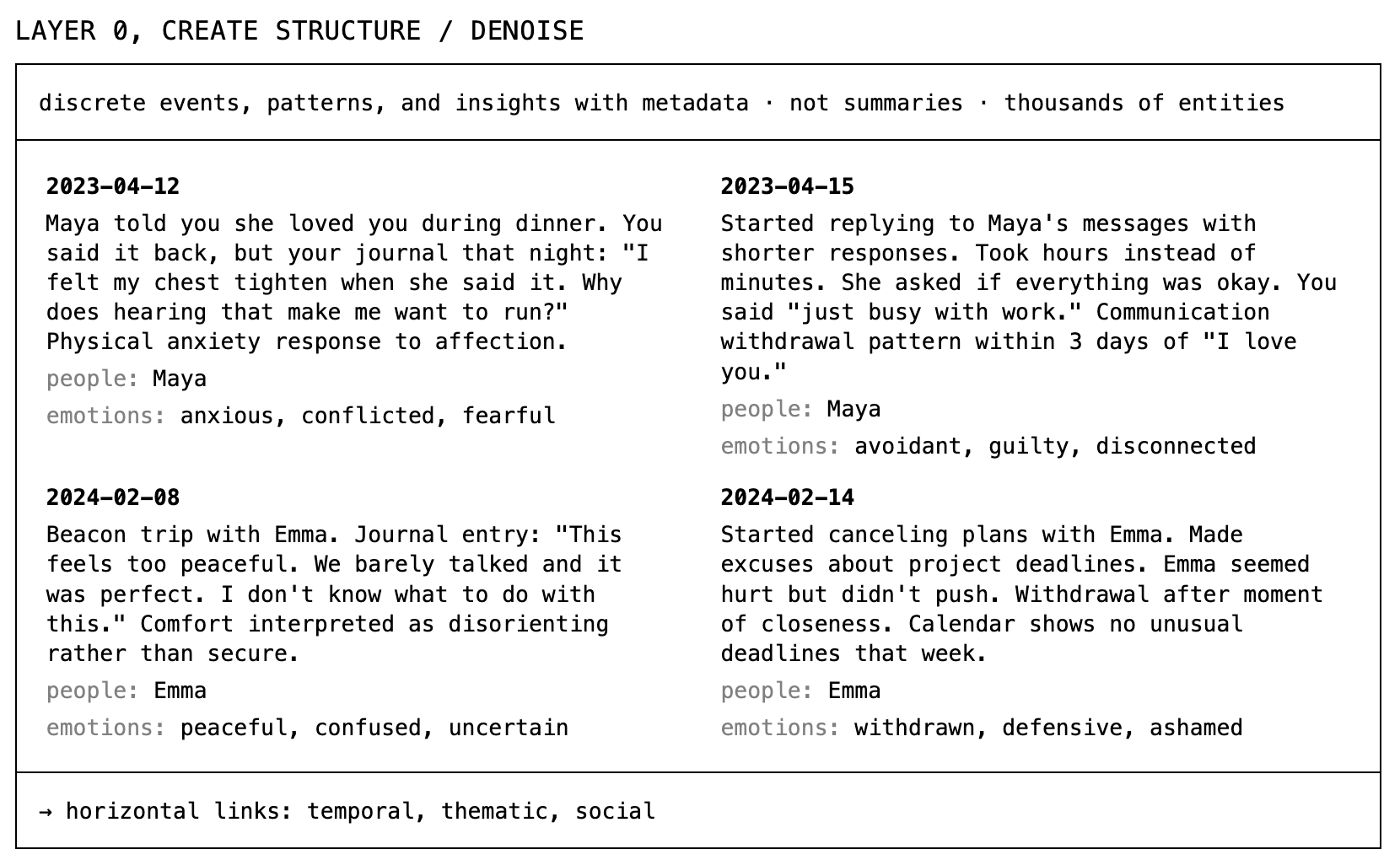 Content-wise, notice how instead of “Maya told you she loved you”, we have “Maya told you she loved you during dinner. You said it back, but your journal that night… Physical anxiety response to affection.” L0 surfaces interpretative signals, precise and compact, with enough details retained to facilitate further aggregation and extraction.