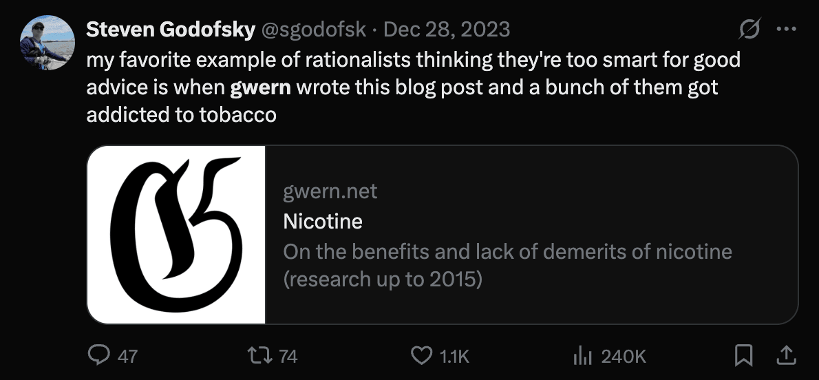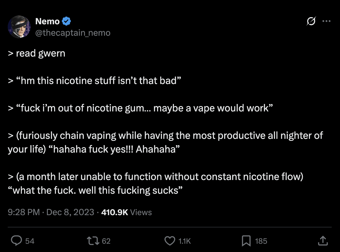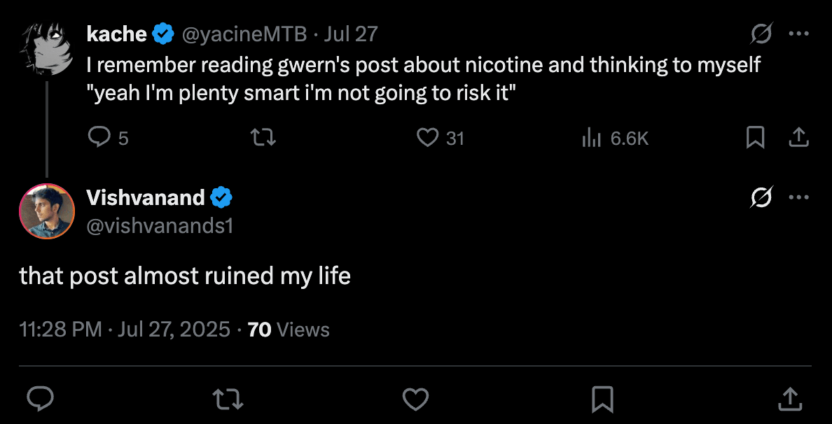 There are many stories about people reading Gwern’s piece on nicotine and developing addiction (see the screenshots in the next block). I knew about these stories, but ignored them anyway, feeling like I was very smart. I was right and I reaped huge benefits: sublingual nicotine has had a big positive effect on my life at limited cost.