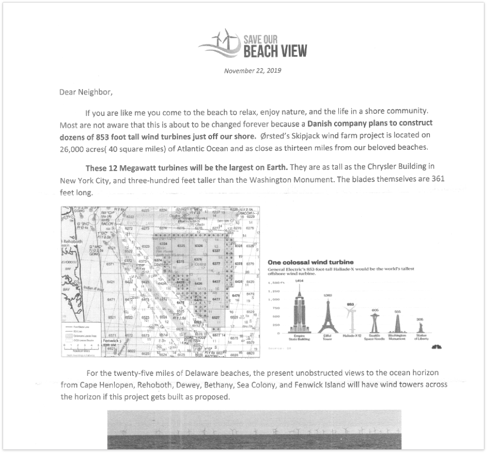 Over the course of a few months, 35,000 homeowners received this letter. Many of these residents would eventually be targeted with Facebook ads, aerial banners flying above the beach, and op-eds in their local paper. While the medium of communication varied, the message was always the same: for coastal residents, Skipjack Wind would ruin life as they knew it.
