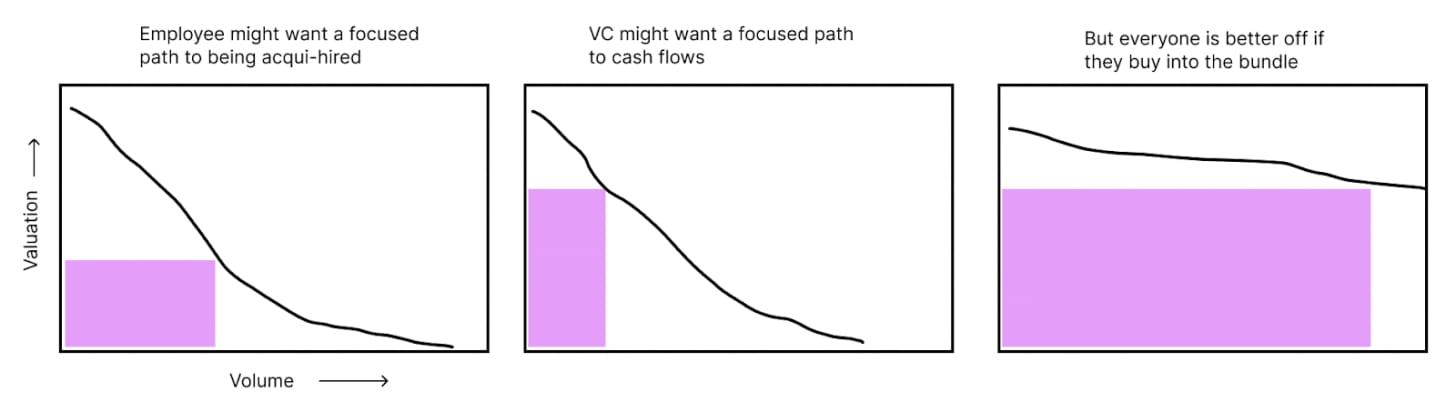 But if startup funding goes the way of the cable bundle - replaced by a more individually crafted mishmash of upside possibilities - I don’t think that’s a good thing. Because the job for founders gets much harder. You lose the economic benefit of the bundle, which was avoiding all of the deadweight loss due to non-consumption that you get when everyone is after their own individual thing. The irony is that the very thing that makes bundles work - the heterogeneity of buyers’ preferences - is itself the thing that breaks the bundle.