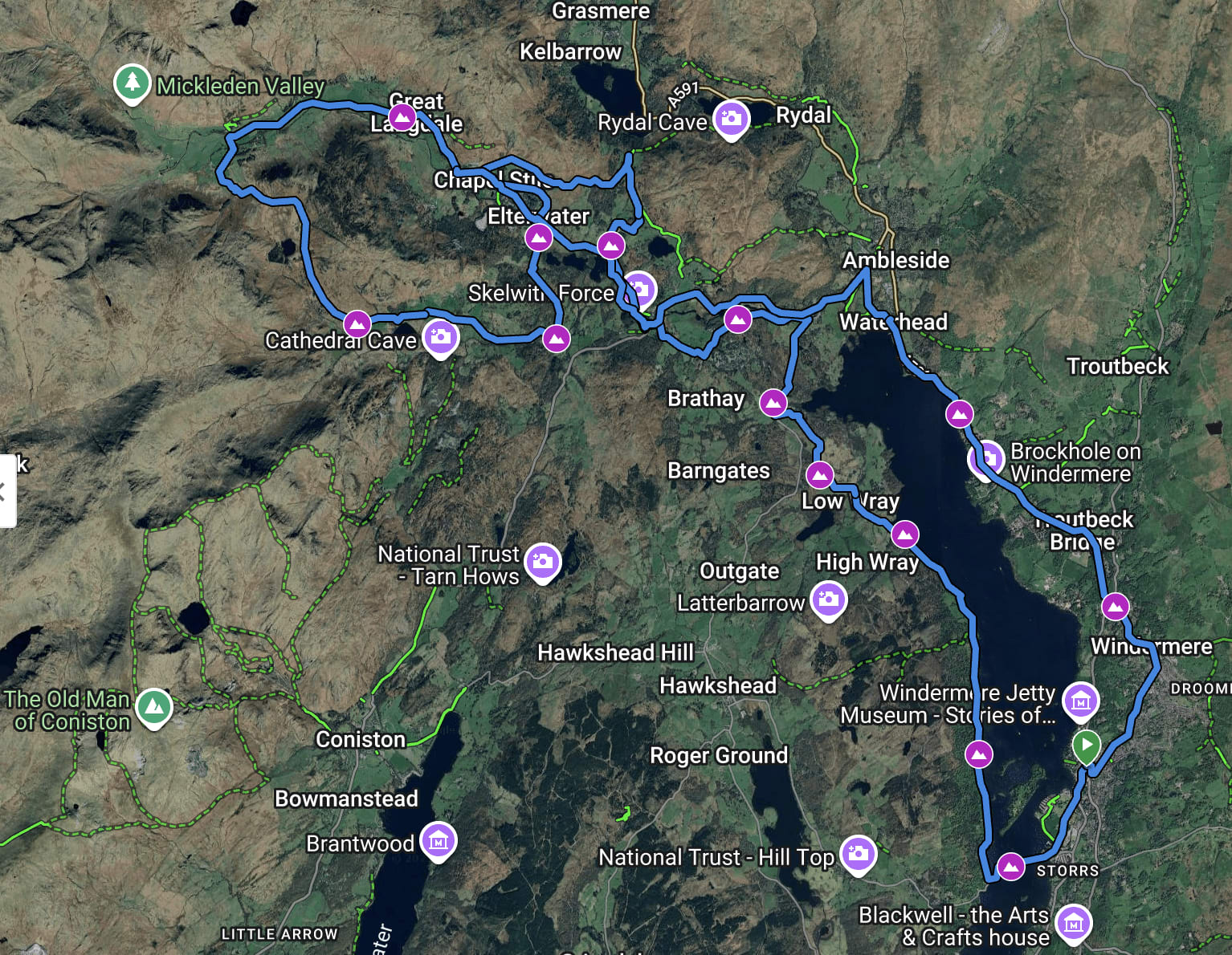 I wanted to bike the region. So I brought my touring bike with me and designed a route around lake Windermere, then up into Elterwater and Corniston, and into the hills. It totalled about 50km. The next day I would do another 50km on a different route. Usually, this is a pretty light distance, but conditions turned the first day into a 5 hour slog that gave me some of the most challenging touring to date.