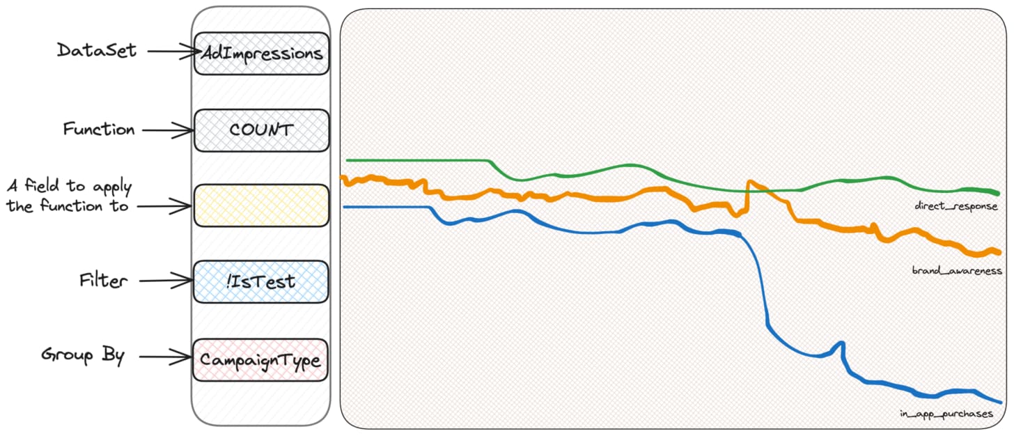 The basic idea of Scuba is extremely simple and doesn’t require a glossary page for people to grasp. It operates with Wide Events. Wide Event is just a collection of fields with names and values, pretty much like a json document. If you need to record some information - whether it’s the current state of the system, or an event caused by an API call, background job or whatever - you can just write some Wide Event to Scuba. For instance, if a system serves ads, the natural desire would be to record Ad Impressions - the facts that a certain ad has been seen by a user. The corresponding Wide Event might be looking like this: