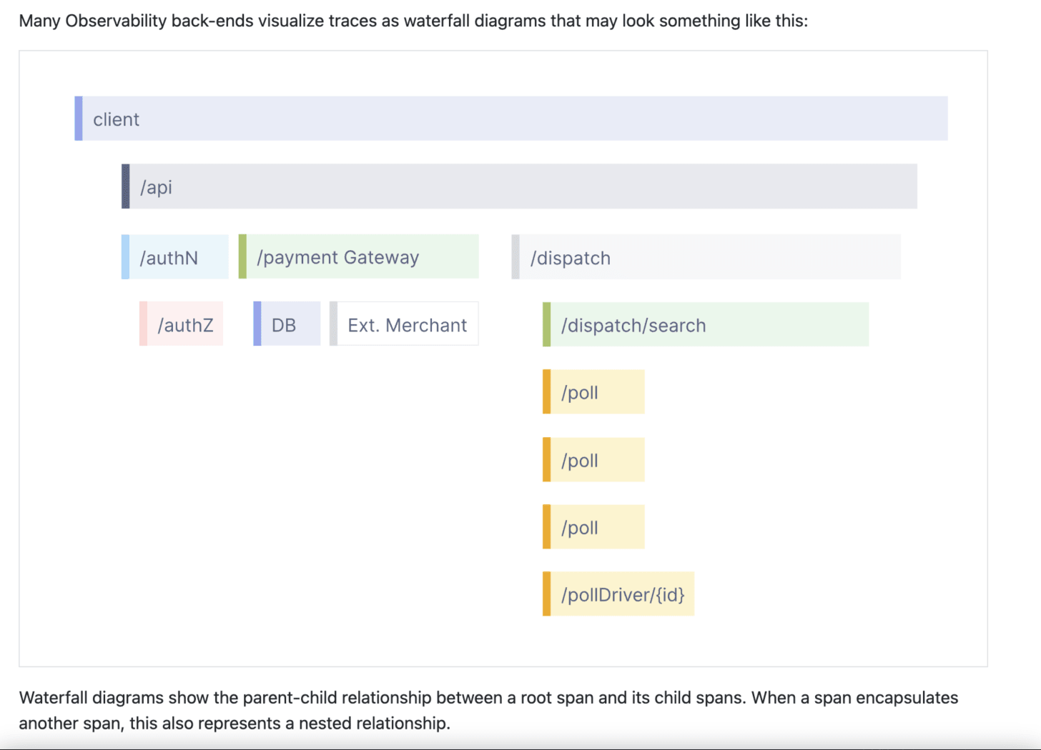 Traces and Spans: These are just wide events having SpanId, TraceId and ParentSpanId fields. So we can filter all spans with a given TraceId, topologically sort them using SpanId → ParentSpanId relation, and draw that distributed tracing view everyone loves.