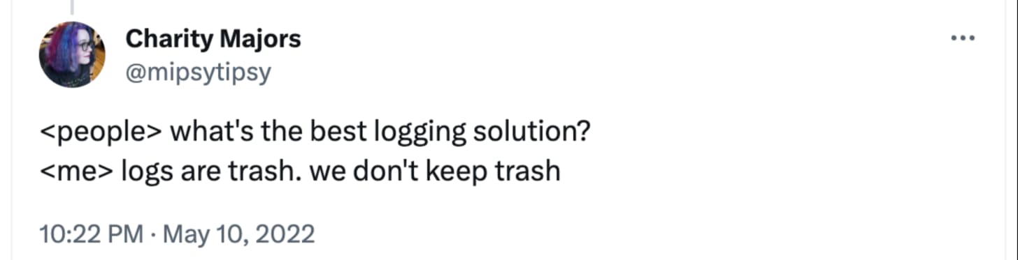 This quote from Charity Majors is probably the best summary of the current state of observability in the tech industry - a total, mass confusion. Everyone is confused. What is a trace? What is a span? Is log line a span? Do I need traces if I have logs? Why I need traces if I have great metrics? The list of questions like these goes on. Charity - together with other great folks from observability system called Honeycomb - have been doing a great job shedding light on these questions. Yet, per my own experience it’s still extremely hard to explain what does Charity meant by “logs are thrash”, let alone the fact that logs and traces are essentially the same things. Why is everyone so confused?