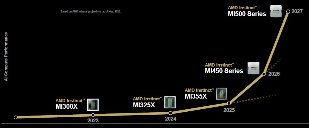 AMD is not saying much about the MI500 series GPUs, but here is a relative performance roadmap: