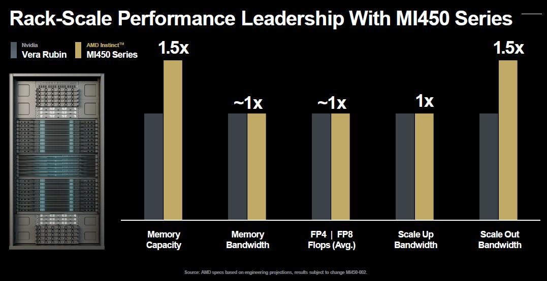Here is how AMD stacks up the future Vera-Rubin compute engines in its Oberon racks against its own Venice-Altair compute engines in its Helios racks: