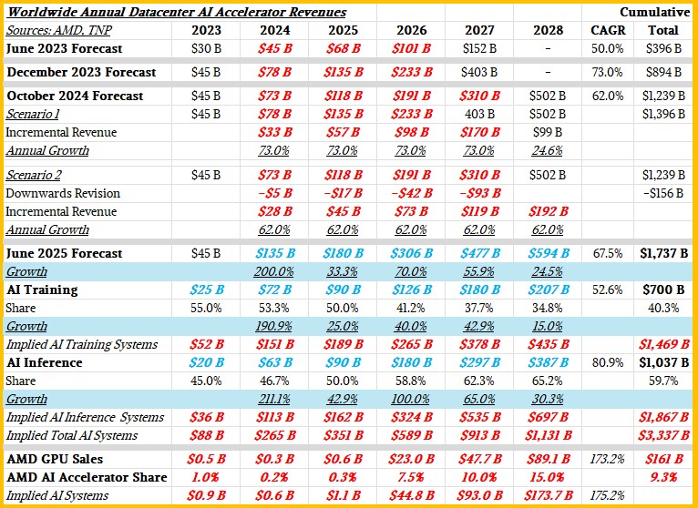 We did a lot of witchcraft back in June on the forecasts to try to separate AI training silicon from AI inference silicon, and then mark this up to what the AI inference and training system revenues might be. Numbers in bold red and bold blue italics are estimates made by The Next Platform to fill in gaps and furth qualify and quantify AMD’s TAM models.