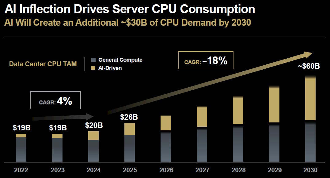 This year, thanks to ancient fleets of machines that need to be upgraded and their workloads consolidated for efficiency, which in turn frees up power, space, and budget for AI systems, the general purpose server market (and its CPU subset) are on the rise again and AMD is projecting growth out to 2030 here. But the AI server CPU piece of the market is expected to grow from around $8.2 billion in 2025 to around $30 billion in 2030, which is a huge spike by server CPU standards.