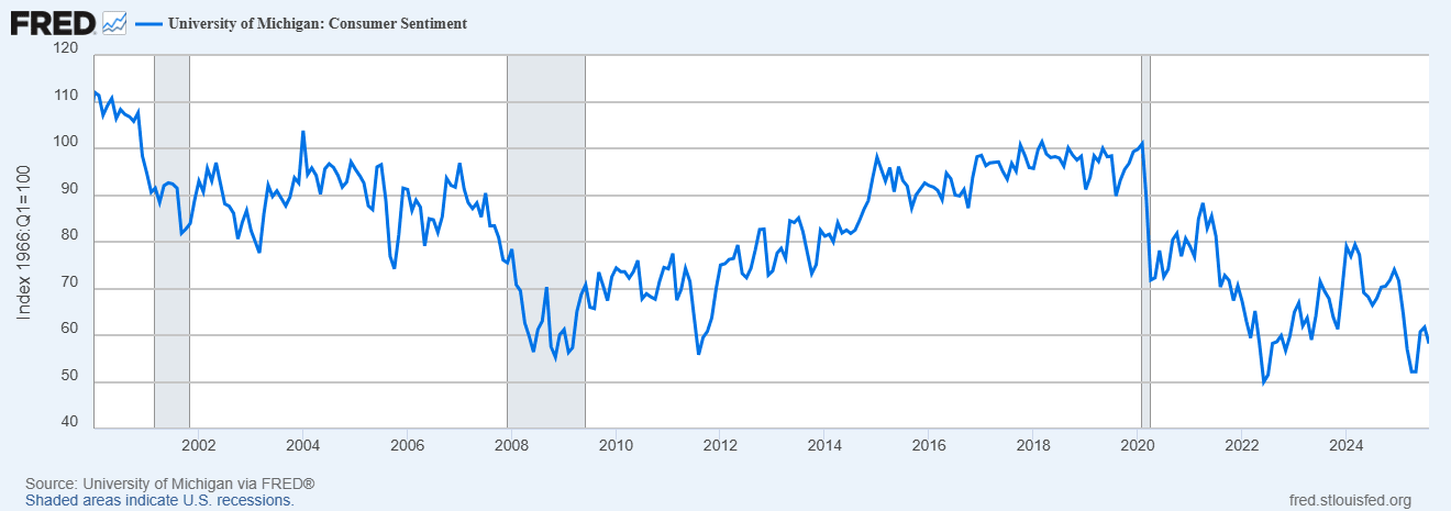 A burning question that’s on a lot of people’s minds right now is: Why is the U.S. economy still holding up? The manufacturing industry is hurting badly from Trump’s tariffs, the payroll numbers are looking weak, and consumer sentiment is at Great Recession levels: