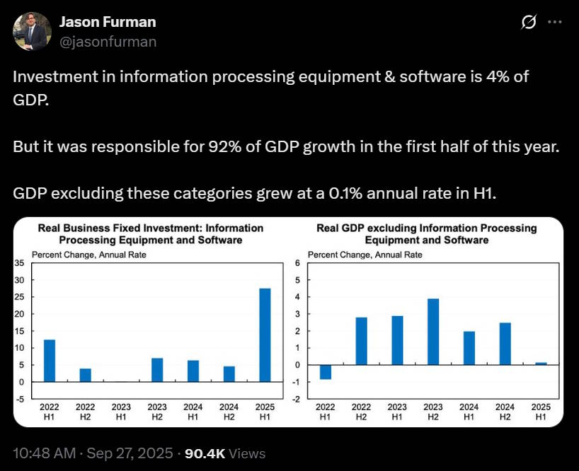 Now as Furman points out, this doesn’t necessarily mean that without AI, the U.S. economy would be stalling out. If the economy wasn’t pouring resources into AI, it might be pouring them into something else, spurring growth that was almost as fast as what we actually saw. But it’s also possible that without AI, America would be crashing from tariffs.
