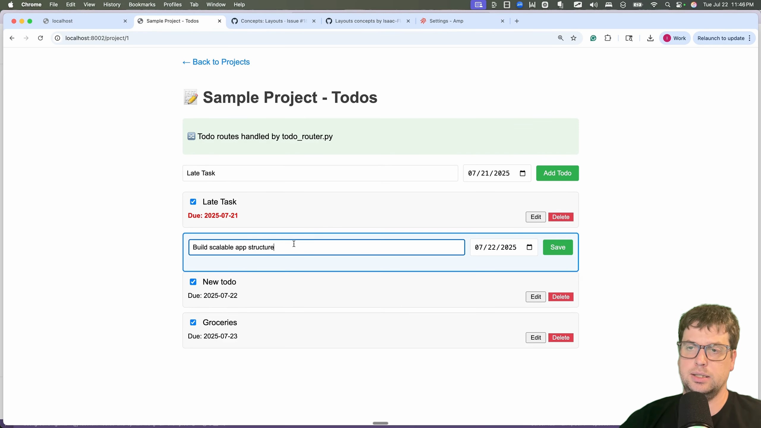 # main.py ... from .domain.projects.router import router as projects_router from .domain.todos.router import router as todos_router ... # Include routers from other files app.include_router(projects_router) app.include_router(todos_router)It also added some helpful sample data and logging, complete with the typical AI-generated emojis [00:04:51].