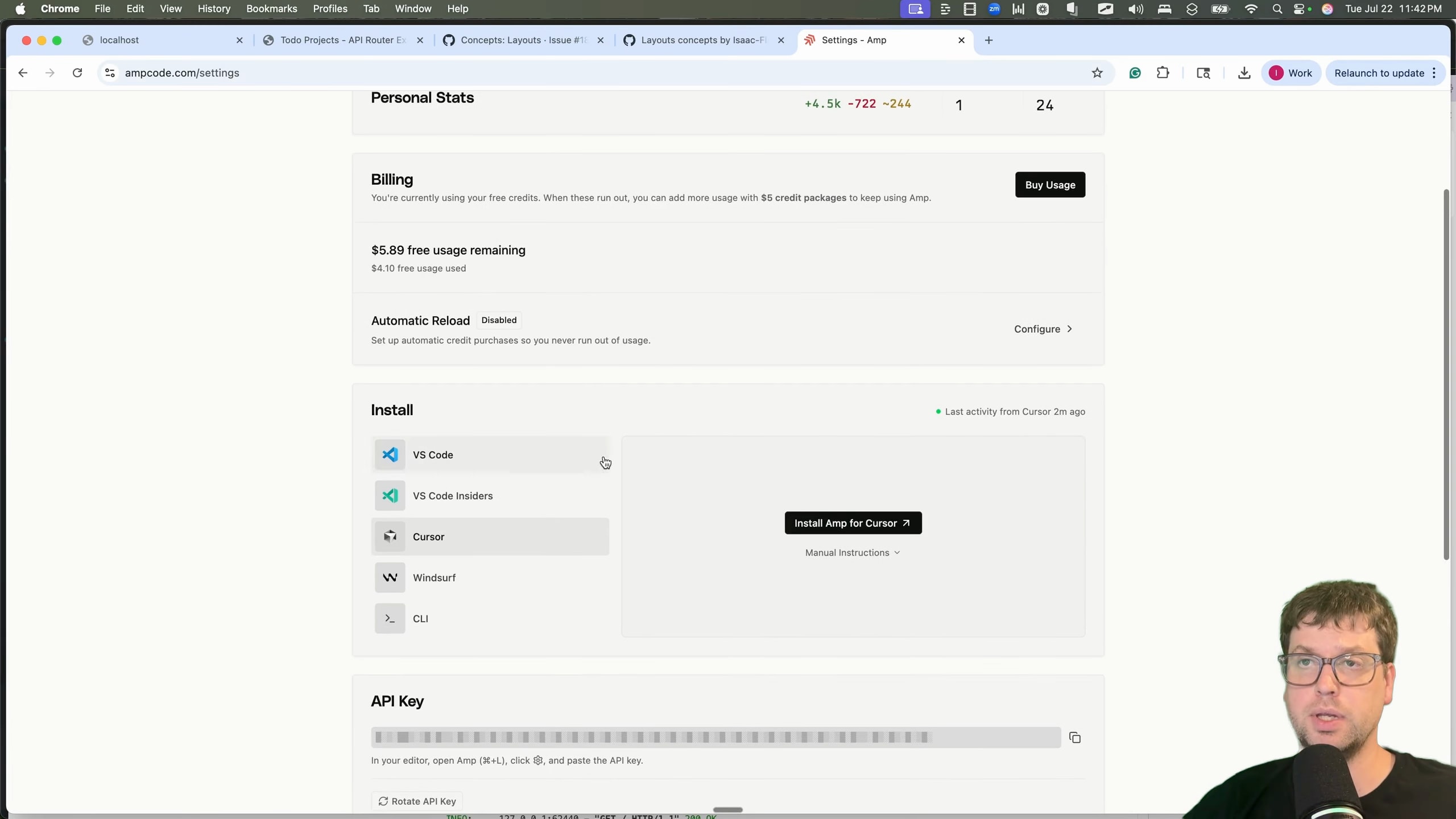 Setting up AMP was easy. It offers integrations for VS Code, Cursor, and a CLI. Since I've been using Cursor a lot lately, I opted for that extension [00:00:15].
