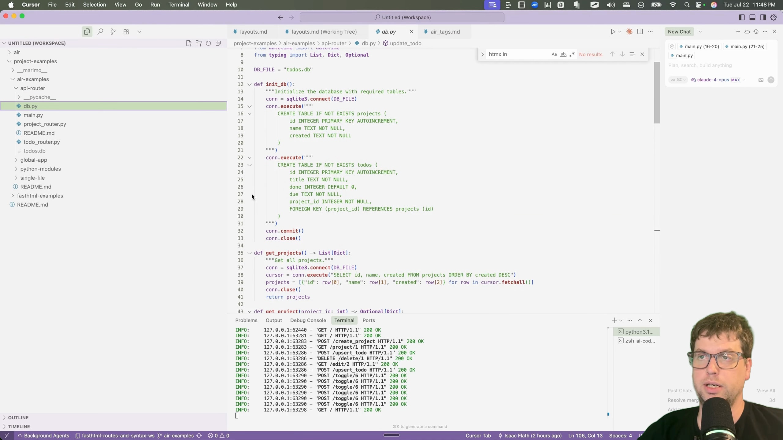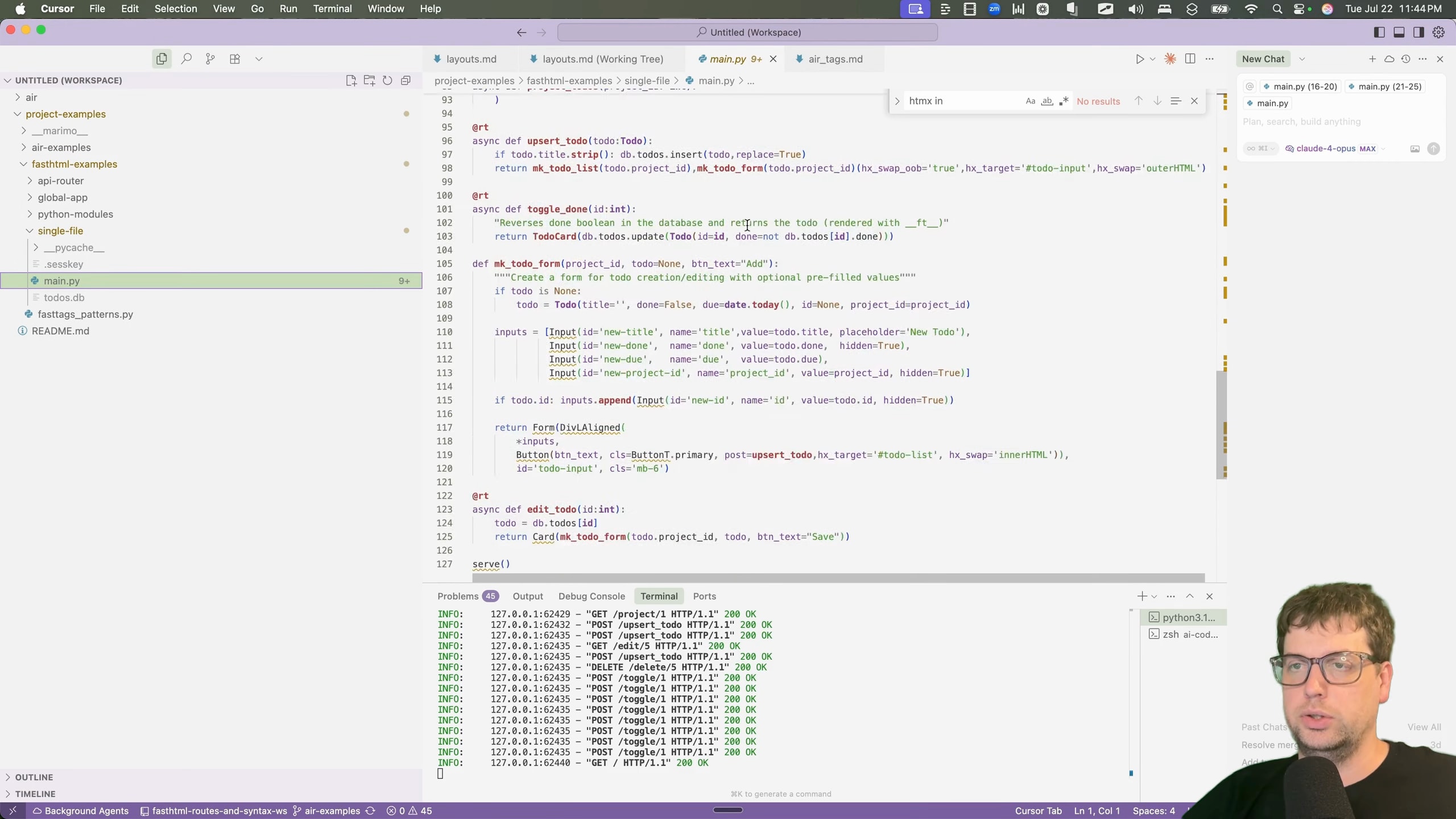 To get started, I needed to get familiar with common web-dev patterns inside of Air. I decided to port a to-do application I had previously built for a talk on the FastHTML framework [00:01:24]. The talk demonstrated various ways to structure a project, from a single file to more complex patterns using API routers and showed 4 different approaches [00:02:03].