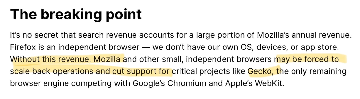 Significantly for Mozilla, one of the most heavily pushed (by the DOJ) remedies would block Google from paying Mozilla for default search engine placement within Firefox. This would, effectively, end over 80% of Mozilla’s yearly revenue… and force the company to dramatically downsize.
