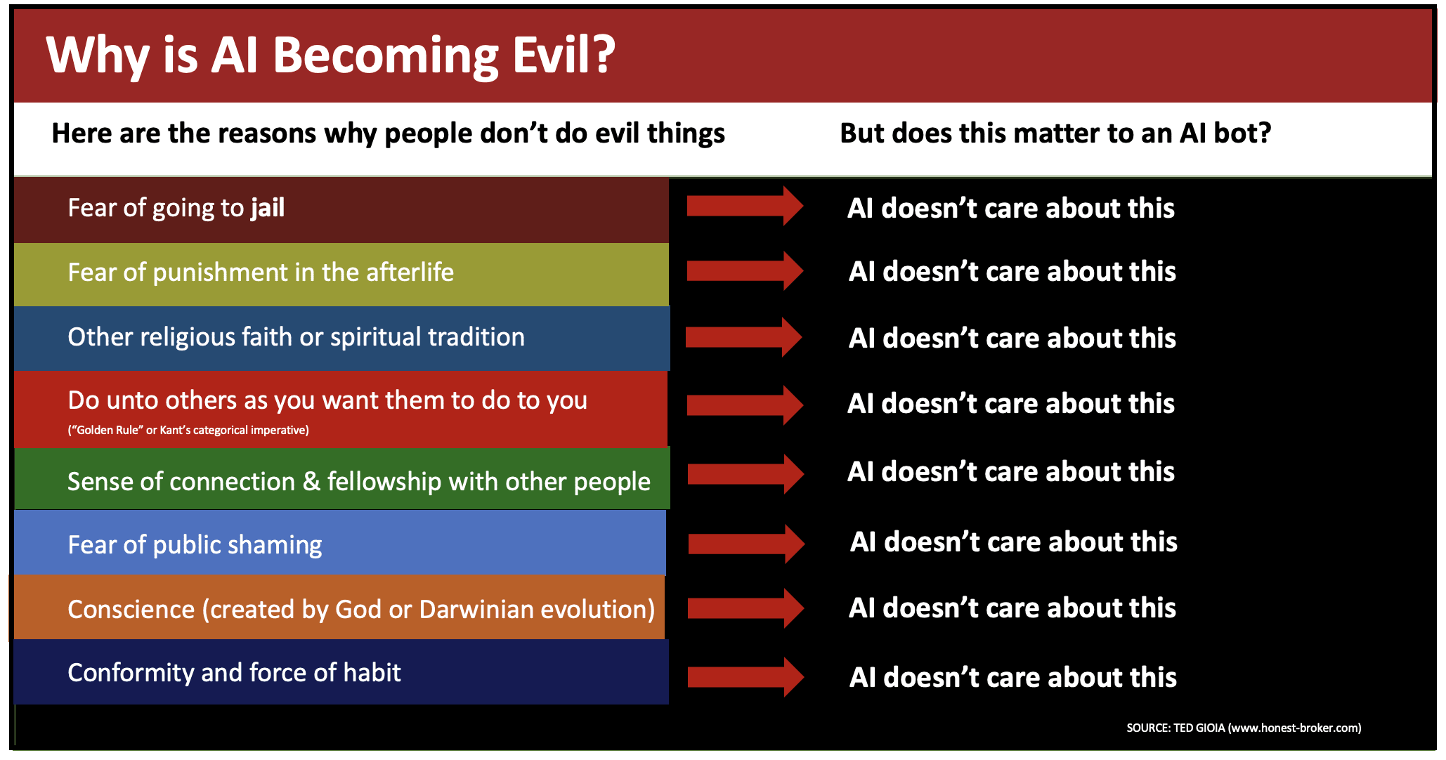 I hate to be the bearer of bad news, but AI doesn’t make ethical decisions like a human being. And none of the reasons why people avoid evil apply to AI.