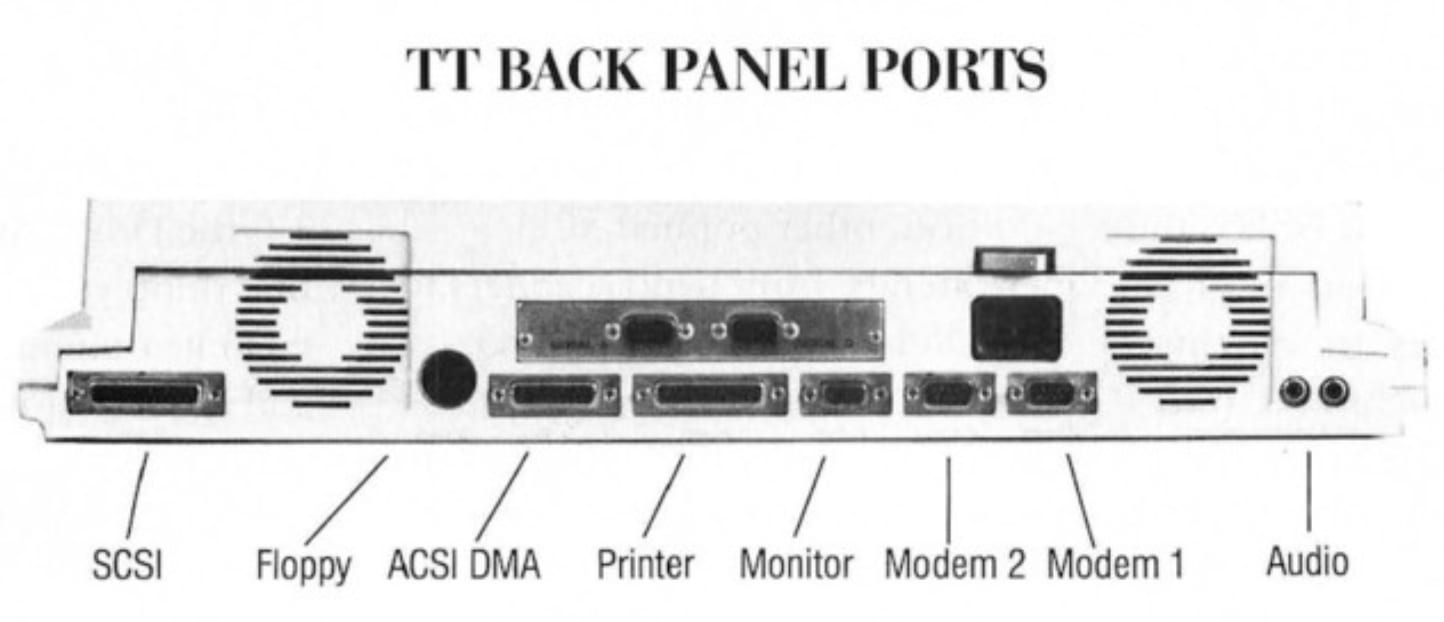 The TT added a couple additional serial ports, a SCSI port and audio output jacks, but otherwise kept the same ports that the ST had (no RF output, though). The TT also had an internal VME slot for adding expansion cards. This port was primarily used for adding graphics cards with even more resolution and colors.