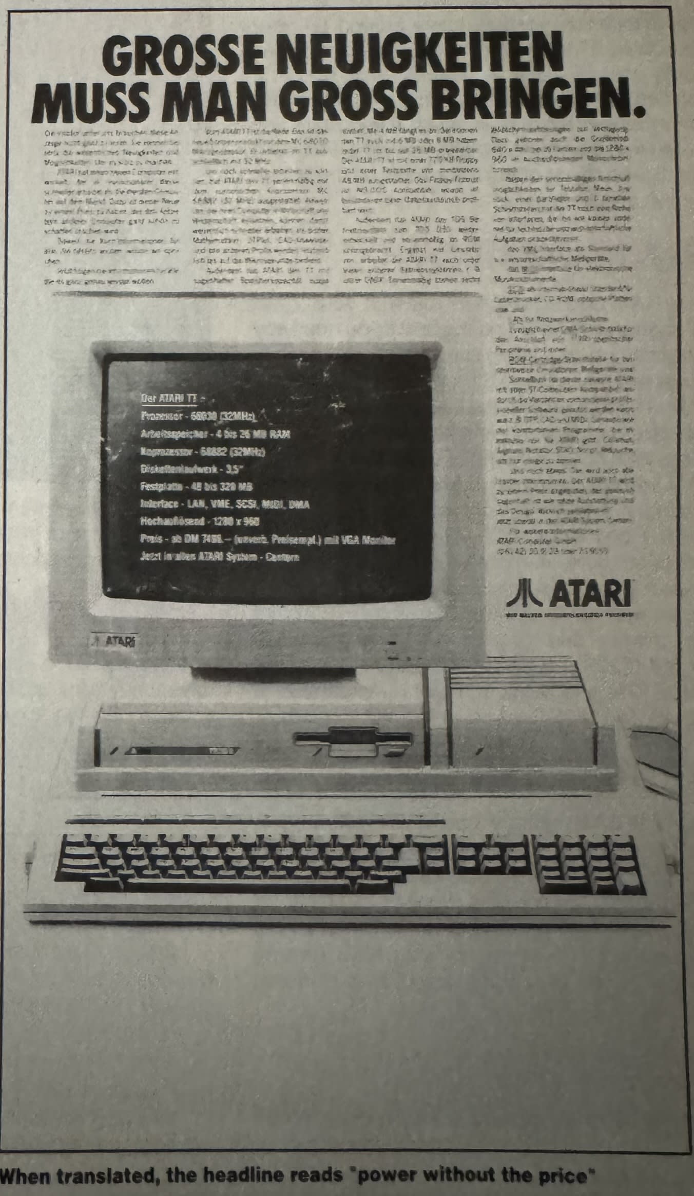 At $3000 ($7400 in 2025), the TT cost much less and was (on paper at least) 32 Mhz. Unfortunately it was still expensive, especially for an Atari that had popularized the marketing slogan “Power without the Price”.