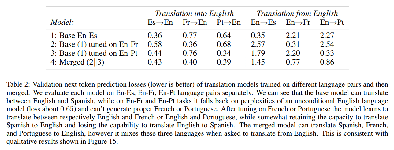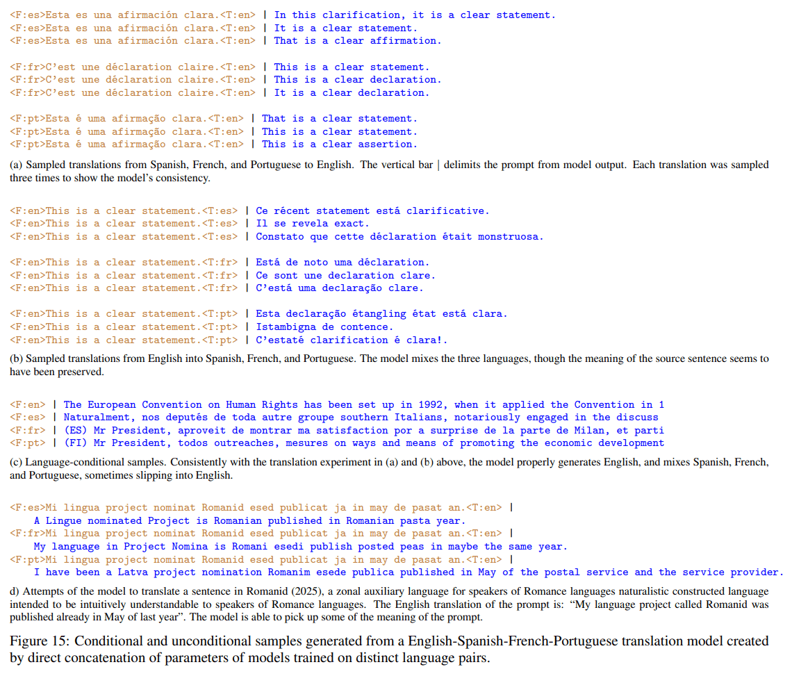 While the merged model shows some “human-like degradation” in generation without fine-tuning (Figure 15), it successfully retains knowledge from both parent models, showcasing a promising path toward treating LLMs as composable computer programs.