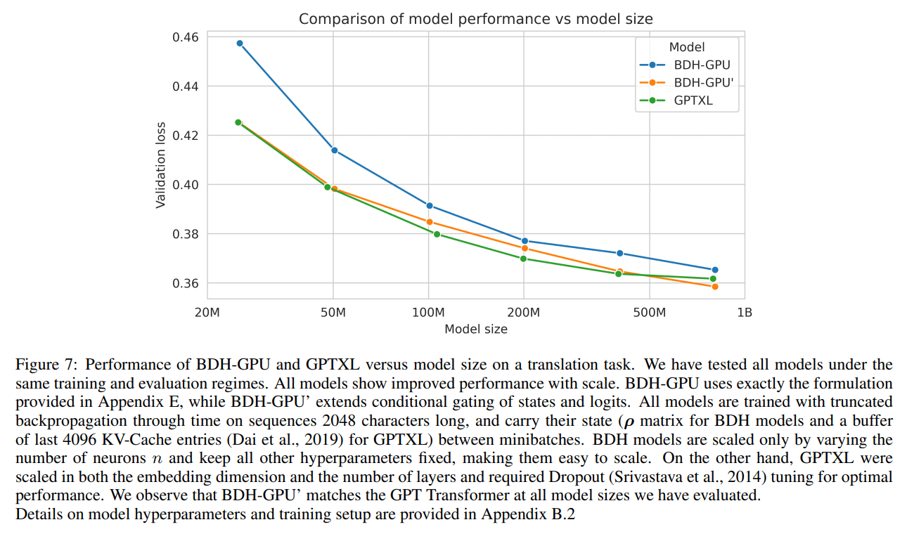 Performance and Scaling: Experiments show that BDH-GPU follows Transformer-like scaling laws. A variant (BDH-GPU’) matches the performance of a GPT-2 style baseline that uses state management from Transformer-XL on translation tasks at scales from 10M to 1B parameters (Figure 7).