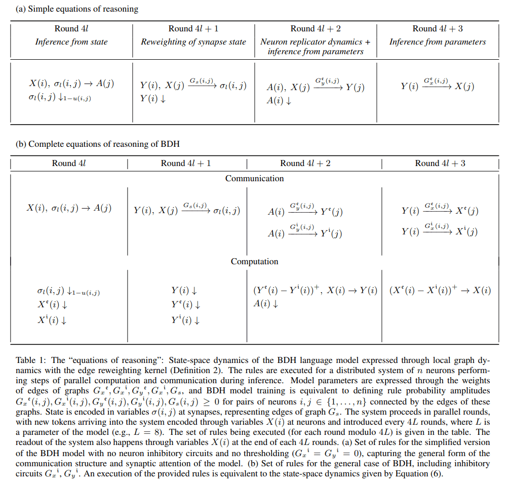 The core theoretical contribution is the Dragon Hatchling (BDH) architecture, a system of n interacting neuron particles whose inference is defined not by global matrix multiplications but by local graph dynamics. The authors formalize this with an edge-reweighting kernel, a set of rules they term the “equations of reasoning” (Table 1).