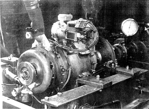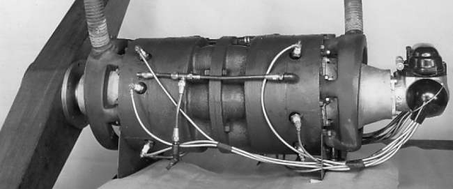 The wobbleplate engine can be seen to the left; to the left of that is a thing like a cotton-reel, presumably the heater/combustion chamber.