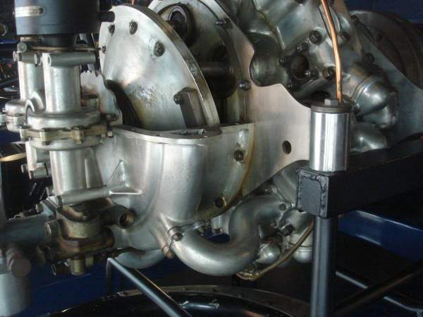 The propellor shaft is at the right, and at the left end of the engine there appears to be some sort of cooling fan for a radiator. Just to the right of the fan is a series of levers of uncertain function- they look to be too far away from the cylinders to be valves. Below this is an auxiliary that is probably a dynamo, driven from the periphery of the fan.