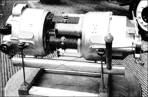 These sections show a four-cylinder two-stroke engine with eight opposed pistons, but it seems that two of the four cylinders (those without fins) are pumping cylinders that compress the charge for the power cylinders. This does not sound as if it would give a good power/weight ratio. A gear-driven magneto is fitted at the left end of the engine; since this does not appear to rotate with the main body of the engine, it is not clear how the electricity was routed to the spark plugs whizzing round.