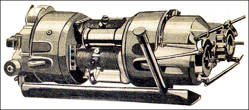 The version shown above is apparently the liquid-cooled two-stroke version; this was later intended for powering early tanks. Only four of the cylinders produced power, the other four were pumping cylinders for the 2-stroke cycle. This would more than outweight any advantage in specific power that could be gained by 2-stroke operation. The output shaft is on the left. At right is a rotary disc valve that controlled the transfer of the fuel/air mixture.