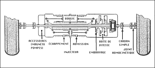 This diagram shows how the axial design allowed for an engine in the form of a narrow cylinder. There is what may have been a conventional clutch, followed by an epicyclic gearbox, which looks as if it might only give three speeds; there is no clue as to how reverse gear was implemented- if it was. To the right of that is the differential. Note that the drive to the left wheel has to pass back through the centre of the engine.