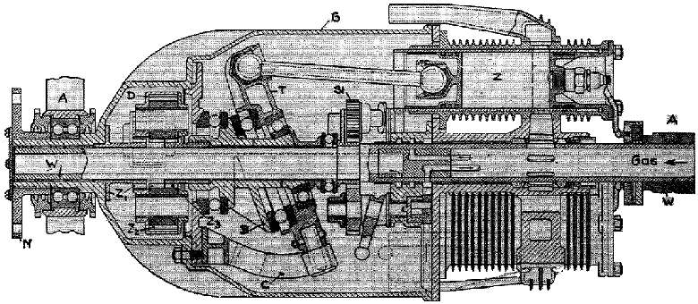 The stationary hollow shaft W rests on bearings A at each end. Around it revolve five cylinders Z, and the housing G carrying flange N for the propellor hub. The housing revolves on hollow shaft W on long bushings and in ball-bearing A at the propeller end. Gear Z1 is screwed to the front end of the revolving housing, and meshes with front planetary gear Z2, which transfers its motion to geared bushing Z3, which revolves at the same speed as housing G but in the opposite direction. The bushing B is keyed to Z3, on which the wobble plate T revolves on two ball bearings, being carried along by arm C which is fixed to housing G.