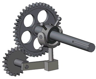 The wobble plate was stabilised with an attached bevel gear that meshed with another fixed to the main body of the engine, preventing the plate from rotating around the crankshaft. The bevel gear teeth are coloured blue in the drawing.