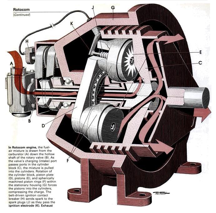 The Rotocom engine, invented by Russell Searle of Sunbury, England, was a three-cylinder four-stroke design. The pistons are rigidly fixed to a plate angled at 12 degrees to the central axis. The cylinder block is fixed to the central shaft, while the angled plate turns on a bearing, and causes the barrel-shaped pistons to move in and out of the cylinders. The barrel shape is necessary because the pistons do not slide straight in and out, but their axis moves in a small circle. Each piston has a sealing ring of Du Pont Vespel polymer, machined to a spherical surface. This was claimed to be gas-tight.
