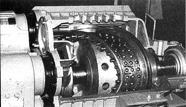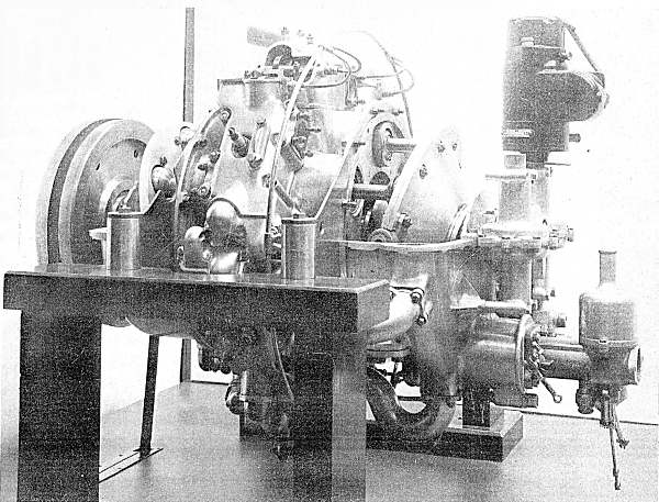 This swashplate engine was intended to run as a two-stroke Diesel. The scavenge air to blow the exhaust gases from the opposed power cylinders in the centre was compressed by the pistons on the left.