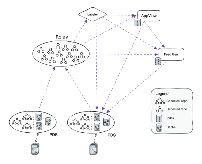 There are several key pieces of code that combine to make the Bluesky network function: A personal data server (PDS) which hosts the official/canonical copies of its users’ posts and profile information. Whenever it’s updated, the data is combined and sent to a Relay server, which combines and indexes posts from many different PDSes to create what social networks call the “firehose,” the collection of all posts made on the network.